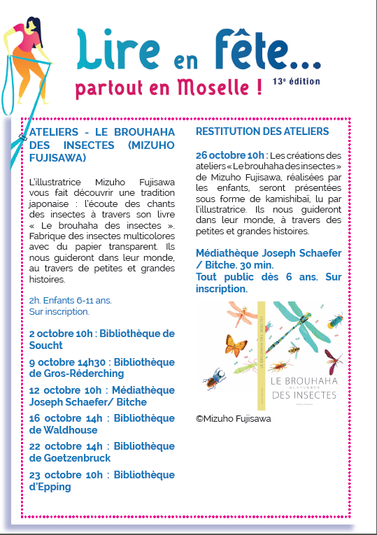 ATELIER avec l’illustratrice Mizuho Fujisawa dans le cadre de la manifestation départementale « Lire en Fête », plus d’informations sur les ateliers ci-dessous :