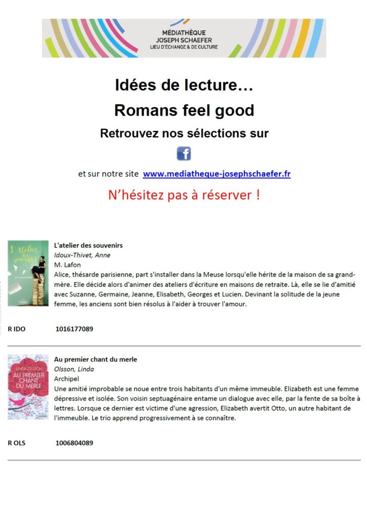 • Vous pourrez également réserver vos livres par téléphone au 03 87 06 15 76 (du mardi au samedi 10h-12h/13h30-17h). Un rendez-vous sera fixé à la médiathèque pour leur retrait. Pour faciliter vos réservations, des listes de nouveautés mais aussi des choix thématiques en jeunesse et en adultes vous seront proposés sur le site internet de la médiathèque https://mediatheque-josephschaefer.fr
