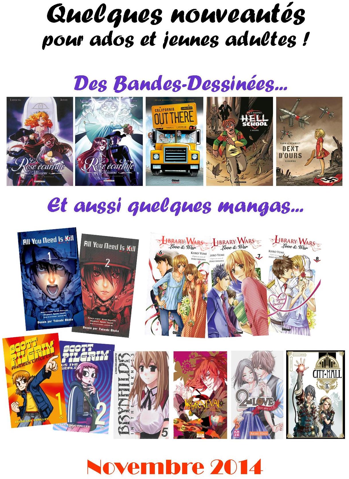 Pour les nouveautés BD et mangas de novembre, le Pôle Ados-Jeunes Adultes vous propose… En BD, Out there, Hell school, Dent d’ours et 2 volumes de la Rose Ecarlate à lire entre les tomes 6 et 7 de la série.