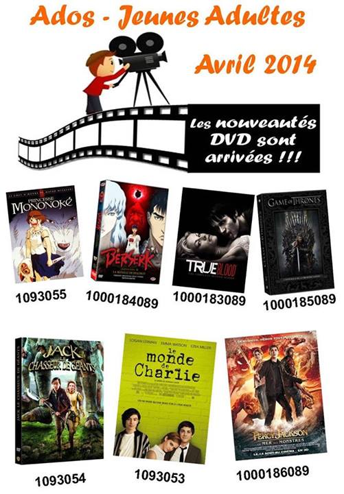 Nouveautés, Pôle Ados/Jeunes Adultes, Vidéo [DVD] Les nouveautés Ados-Jeunes Adultes d’avril ! 11 avril 2014 M3diatheque Laisser un commentaire Dès cet après-midi, découvrez les nouveaux DVD du Pôle Ados-Jeunes Adultes ! Pour vous, la saison 2 de True Blood, Le Monde de Charlie, Percy Jackson et la mer des monstres, la saison 1 de Game of Thrones, Princesse Mononoke et d’autres encore !