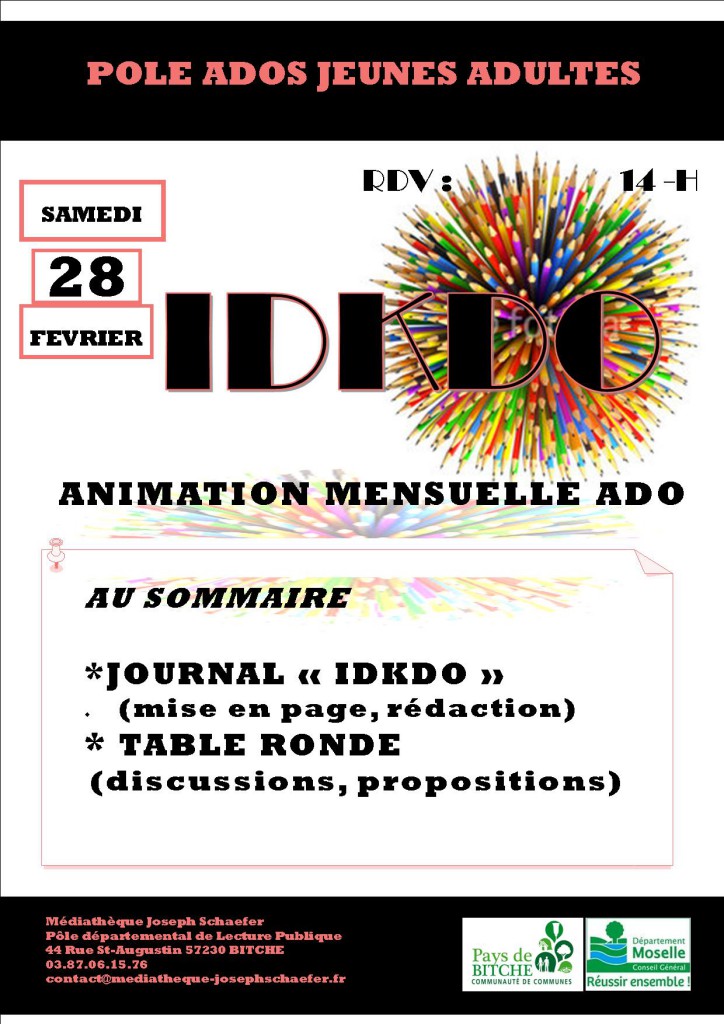 Animations, IDEKDO, Pôle Ados/Jeunes Adultes [Animations] « IDKADO » samedi 28 février ! Image 10 février 2015 M3diatheque Laisser un commentaire Samedi 28 FEVRIER à 14h RDV mensuel des ados et jeunes adultes! Venez faire un tour!!! 13-18 ANS