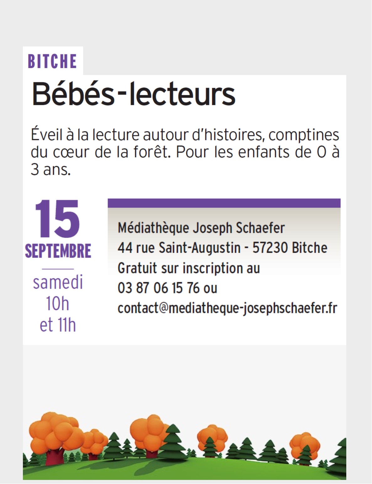 N’hésitez pas à inscrire vous bout’choux au 03.87.06.15.76 ou par mail à contact@mediatheque-josephschaefer.fr