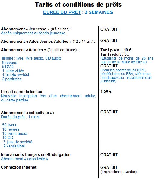 La consultation de documents sur place est gratuite. L’inscription est obligatoire pour emprunter des documents et s’effectue sur présentation d’une pièce d’identité. Les mineurs doivent être accompagnés de leurs parents ou tuteurs légaux pour s’inscrire.