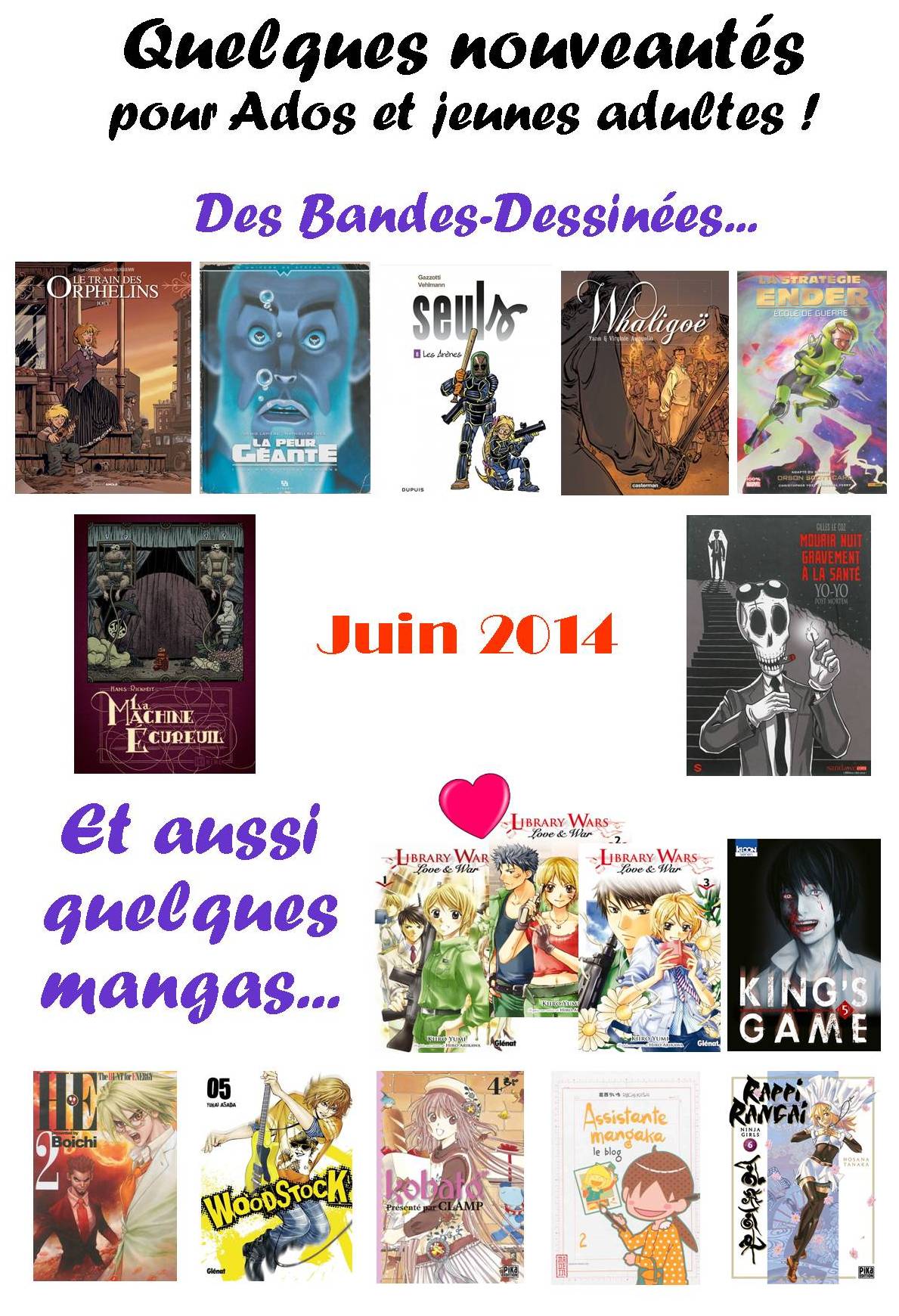 Côté manga, découvrez  Library Wars,  profitez des suites de Woodstock, Assistante Mangaka, Kobato, the Hunt for Energy ou Rappi Rangaï et apprenez la fin de King’s Game…