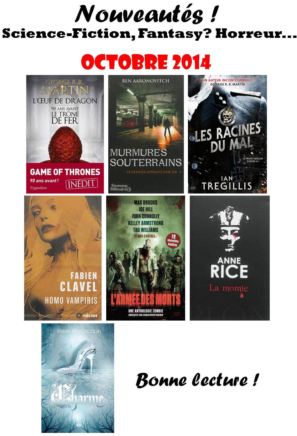 Pour vous, en octobre nous avons choisi Murmures souterrains de Ben Aaronovitch, L’armée des morts (recueil de nouvelles sur les zombies), Homo Vampiris de Fabien Clavel, L’oeuf de dragon de George R.R. Martin, Charmes de Sara Pinborough, Les racines du mal d’Ian Tregillis et La momie d’Anne Rice.