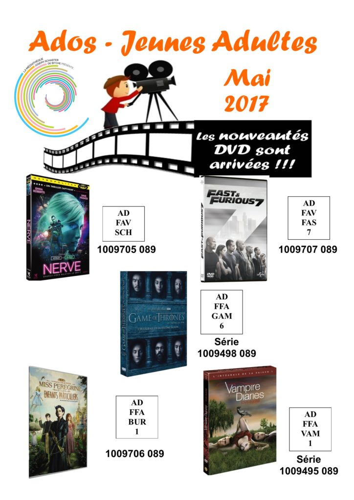 Nouveautés, Pôle Ados/Jeunes Adultes, Vidéo [ADOS-JEUNES ADULTES] NOUVEAUTES DVD DE MAI. 5 mai 2017 M3diatheque Laisser un commentaire Découvrez les nouveautés DVD de mai dans l’Espace DVD, sur le palier !