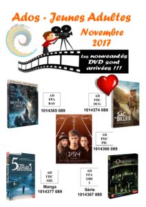 Nouveautés, Pôle Ados/Jeunes Adultes, Vidéo [ADOS-JEUNES ADULTES] NOUVEAUTES DVD DE NOVEMBRE. 2 novembre 2017 M3diatheque Laisser un commentaire Découvrez les nouveautés DVD de novembre dans l’Espace DVD, sur le palier !