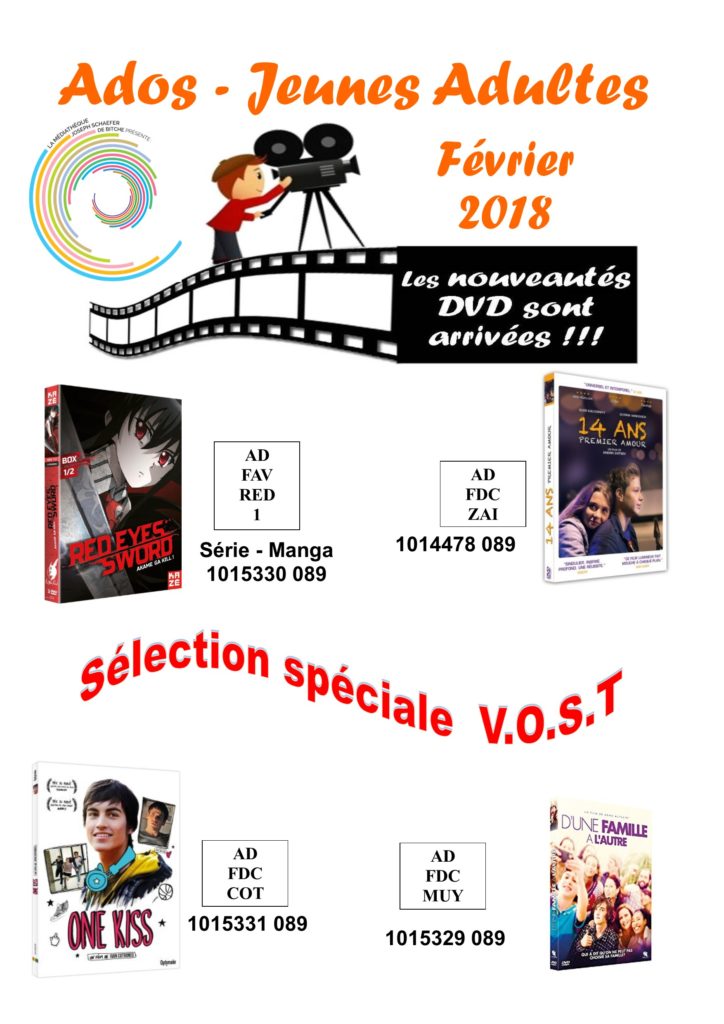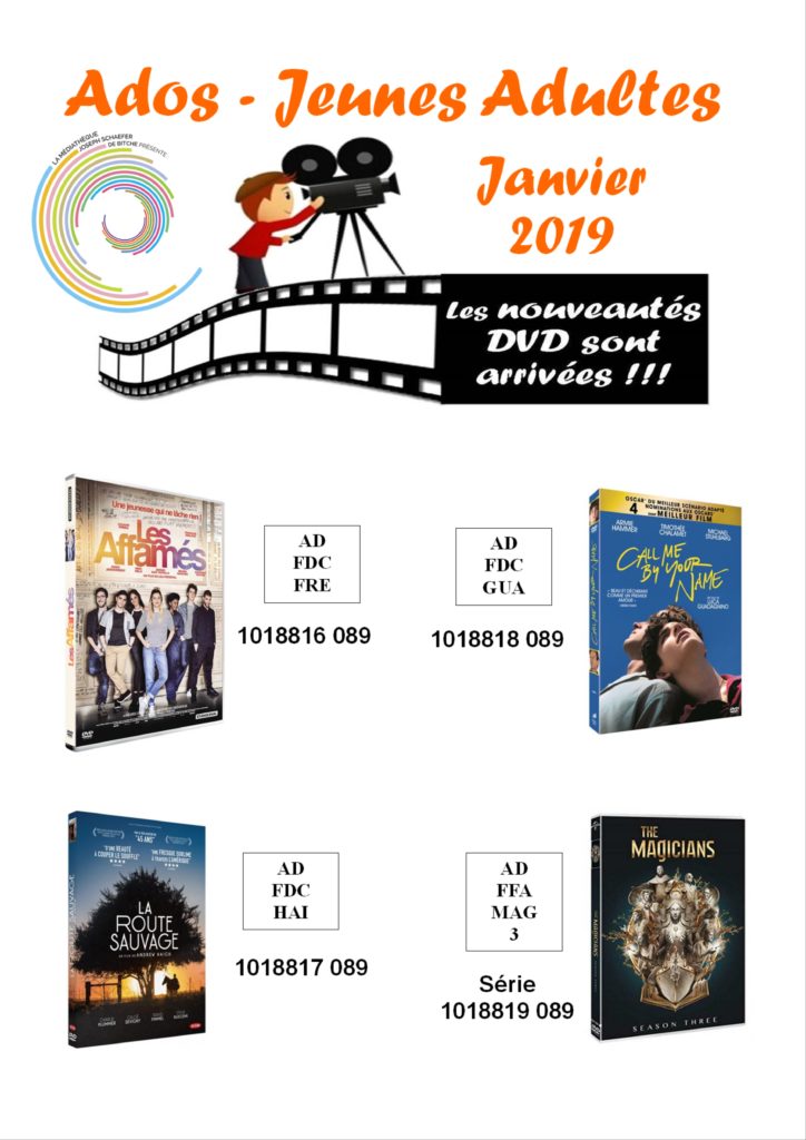 Nouveautés, Pôle Ados/Jeunes Adultes, Vidéo [ADOS-JEUNES ADULTES] NOUVEAUTES DVD DE JANVIER. 29 janvier 2019 M3diatheque Laisser un commentaire Découvrez les nouveautés DVD de février dans l’Espace DVD, sur le palier ! Découvrez les nouveautés DVD de février dans l’Espace DVD, sur le palier !
